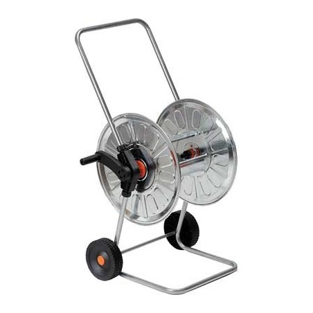 Telaio e rullo in acciaio zincato, ruote in polipropilene. Adatto a piccole e medie superfici. Portata tubo: 80 m da 1/2" o 50 m da 3/4".
