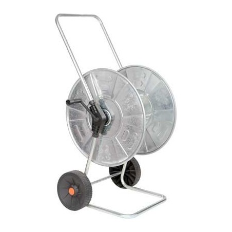 Telaio e rullo in acciaio zincato, ruote in polipropilene, robusta manovella con anima in acciaio. Adatto a medie superfici. Portata tubo: 110 m da 1/2" o 80 m da 3/4".