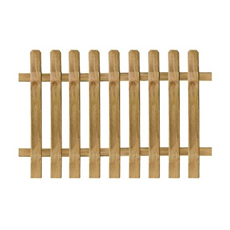 Staccionata in legno a pannelli in Pino impregnato in autoclave per esterno. Tavolette con estremità stondata di sezione 15x95 mm traverse di sezione 60x16 mm. La distanza tra le tavolette è di circa 7 cm. Prodotto montato per mezzo di chiodi.