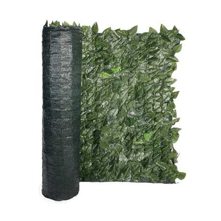 Siepe decorativa con foglie tipo lauro in poliestere fissate su supporto in PVC con l'aggiunta di rete ombreggiante. Ideali per proteggere la privacy e l'intimità della casa, terrazzo e giardino, e riparare dal vento. Colore verde scuro.