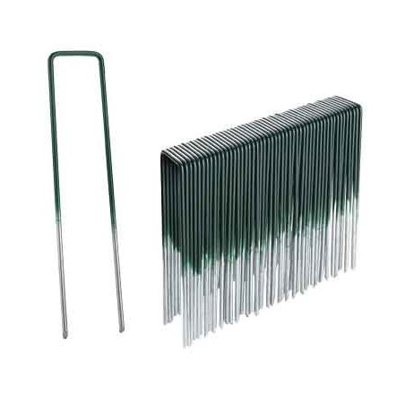 Picchetti zincati a caldo per una maggiore prevenzione alla rugine. Il rivestimento superiore verde lo rende perfetto per il fissaggio di erba sintetica. Le estremità sono affilate, appuntite e smussate per un fissaggio e una rimozione più facile. Questa tipologia di picchetti crea molti meno danni al tessuto rispetto alle soluzioni taglienti in plastica.