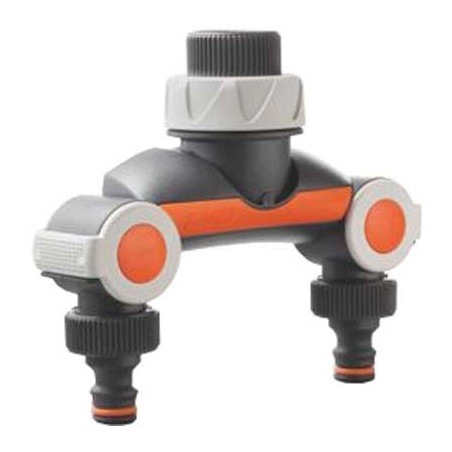 Presa rubinetti doppia uscita con regolazione del flusso differenziato. Regolatore-modulatore di portata per ciascuna uscita per regolare separatamente il flusso fino a totale chiusura. Utile per l'attacco simultaneo di più accessori. Connessione a scatto. Confezione blister.