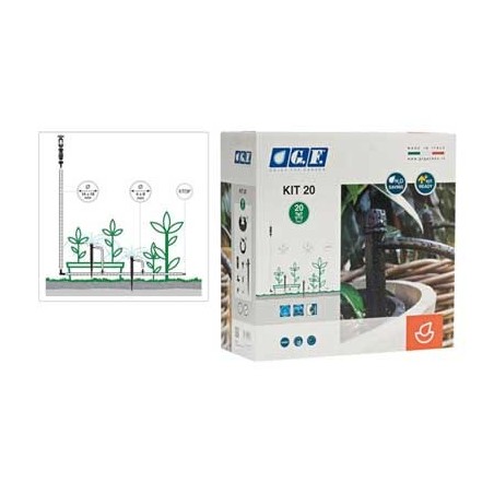 Assortimento completo per balcone, terrazzo o aiuole. Composto da: 1 riduttore di pressione, 1 presa rubinetto 3/4" gas x tubi ø 14x16 mm e ø 4x6 mm, 25 m di tubo collettore ø 14x16 mm, 20 m di tubo capillare ø 4x6 mm, 20 gocciolatori a 360° regolabili da 0 a 60 l/h, 3 raccordi a gomito per tubi ø 14x16 mm, 2 raccordi dritti per tubi ø 14x16 mm, 1 tappo fine linea per tubi ø 14x16 mm, 1 foratubi.